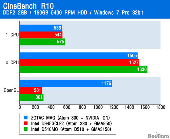 CineBench R10 º¥Ä¡¸¶Å© °á°ú °°Àº ÀÎÅÚ ¾ÆÅè 330 CPU¸¦ »ç¿ëÇÏ´Â ZOTAC MAG¿Í ³ÝžÀº CPU Å×½ºÆ®¿¡¼ Å« Â÷À̰¡ ¾ø¾ú°í, ½ÅÇü ÆÄÀÎ Æ®·¹ÀÏ ¾ÆÅè D510ÀÌ À̵麸´Ù Á»´õ ³ôÀº Á¡¼ö¸¦ ±â·ÏÇß´Ù.