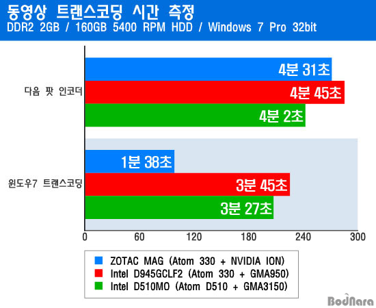 ¸ÕÀú ´ÙÀ½ ÆÌ ÀÎÄÚ´õ¸¦ »ç¿ëÇØ 1080p H.264 µ¿¿µ»óÀ» ¾ÖÇà ¾ÆÀÌÆÌ ÅÍÄ¡ °íÈÁú(AVC)¿ëÀ¸·Î º¯È¯Çϴµ¥ °É¸° ½Ã°£À» ÃøÁ¤Çߴµ¥, ´ÙÀ½ ÆÌ ÀÎÄÚ´õ´Â GPU ±â´ÉÀ» »ç¿ëÇÏÁö ¾Ê¾Æ CPUÀÇ ÈûÀ¸·Î¸¸ º¯È¯À» Çϱ⠶§¹®¿¡ ¾ÆÀ̿ Ç÷§ÆûÀ» ¾´ ZOTAC MAGµµ ÆÄÀÎ Æ®·¹ÀϺ¸´Ù ´À¸° ½Ã°£À» ±â·ÏÇß´Ù.