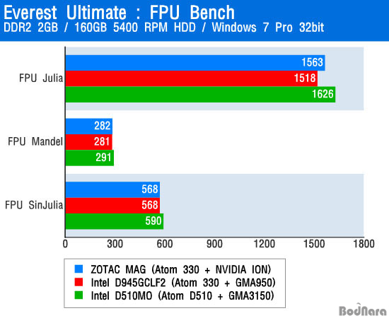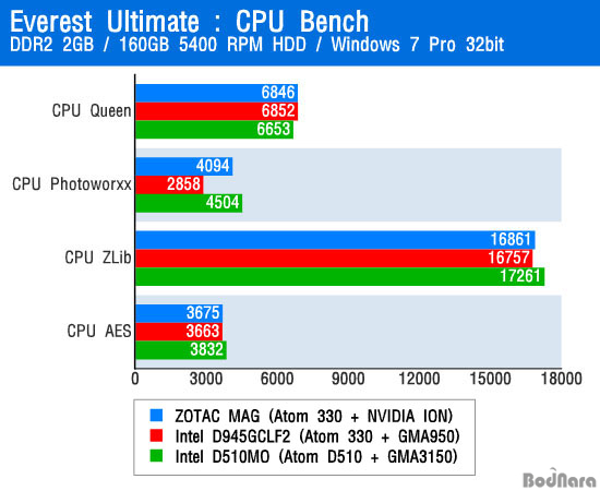 Everest Ultimate 5.30.1946 ¹öÀüÀ» »ç¿ëÇØ CPU º¥Ä¡¸¶Å©¸¦ ½ÇÇàÇÑ °á°ú µ¿ÀÛ Å¬·°ÀÌ º°·Î Â÷À̰¡ ³ªÁö ¾Ê´Â ¾ÆÅè 330(1.6GHz)°ú ÆÄÀÎ Æ®·¹ÀÏ¿ë ¾ÆÅè D510(1.66GHz)ÀÇ ¼º´ÉÀº ºñ½ÁÇÏ°Ô ÃøÁ¤µÇ¾ú´Ù. CPU Photoworxx¿¡¼´Â ¼º´É Â÷À̰¡ ¸¹ÀÌ ¹ú¾îÁ³´Âµ¥, ¾ÆÅè 330 ÇÁ·Î¼¼¼¸¦ ¾²¸é¼µµ ¿£ºñµð¾Æ ¾ÆÀ̿ Ĩ¼ÂÀÌ µé¾î°¡´Â ZOTAC MAG´Â ÆÄÀÎ Æ®·¹ÀÏ Ç÷§Æû¿¡ ±ÙÁ¢ÇÑ ¼º´ÉÀ» ³Â´Ù.