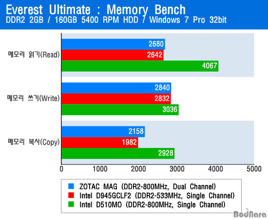 ÇÏÁö¸¸ ¸Þ¸ð¸® ´ë¿ªÆøÀ» ÃøÁ¤Çغ¸¸é ¾ÆÀ̿ ±â¹Ý ZOTAC MAG´Â ¾ÆÅè 330 ³Ýž Ç÷§Æû°ú °ÅÀÇ °°Àº ¼öÁØÀÇ ¸Þ¸ð¸® ¼º´ÉÀ» º¸¿©ÁÖ¸ç, ¿ÀÈ÷·Á ¾ÆÅè ÆÄÀÎ Æ®·¹ÀÏ ÂÊÀÌ ¸Þ¸ð¸® ¼º´ÉÀº ¾ÆÀ̿º¸´Ù ´õ ³ô°Ô ³ª¿Â´Ù. ±¸Çü ¾ÆÅè°ú ¾ÆÀ̿ Ç÷§Æû ¸ðµÎ FSB 533MHz·Î µ¿ÀÛÇϱ⠶§¹®¿¡ FSB 667MHz¿¡ ¸Þ¸ð¸® ÄÁÆ®·Ñ·¯¸¦ CPU ¾È¿¡ ³»ÀåÇÑ ¾ÆÅè D510À» µû¶ó°¡±ä ¾î·Á¿î °Í °°´Ù.