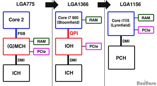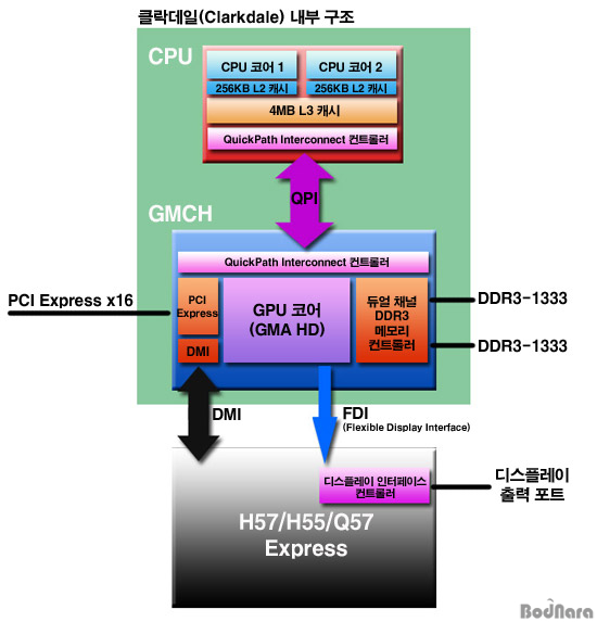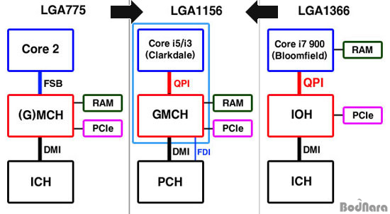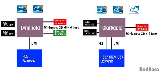 LGA1156 ¼ÒÄÏÀ¸·Î ¸¸µé¾îÁø ÄÚ¾î i7/i5(¸°Çʵå)¿¡ ¿À¸é¼­ PCI Express ÄÁÆ®·Ñ·¯µµ ¸Þ¸ð¸® ÄÁÆ®·Ñ·¯¿Í ÇÔ²² CPU ¾ÈÀ¸·Î µé¾î°¬°í, ³ë½ººê¸´Áö¸¦ ¿ÏÀüÈ÷ Èí¼öÇ߱⠶§¹®¿¡ CPU¿Í ³ë½ººê¸´Áö »çÀÌÀÇ ¹ö½º´Â »ç¶óÁö°í CPU¿Í PCH¸¸ DMI ¹ö½º¸¦ »ç¿ëÇØ ¿¬°áÇϵµ·Ï ±¸¼ºµÇ¾ú´Ù.