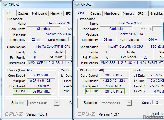 Ŭ¶ôµ¥ÀÏ ±â¹Ý ÀÎÅÚ ÄÚ¾î i5-600 ½Ã¸®Áî´Â CPU-Z¿¡¼­ CPU¿Í GMCH¸¦ ÀÕ´Â QPI ¹ö½º ¼Óµµ°¡ ºí·ëÇʵå¿Í µ¿ÀÏÇÑ 6.4GT/s(133MHz x24 x2)·Î µ¿ÀÛÇÏ´Â °É·Î ³ª¿À¸ç, ÄÚ¾î i3-530ÀÇ °æ¿ì´Â À̺¸´Ù ³·Àº 5.85GT/s(133MHz x22 x2)ÀÇ ¼Óµµ¸¦ °®´Â´Ù. ÀÌ ¶§¹®¿¡ °°Àº µà¾ó ä³Î DDR3-1333MHz ¸Þ¸ð¸® ¼³Á¤¿¡µµ ÄÚ¾î i3-530°¡ ÄÚ¾î i5-670/661º¸´Ù ¸Þ¸ð¸® ¼º´ÉÀÌ ´õ ³·°Ô ÃøÁ¤µÈ´Ù.