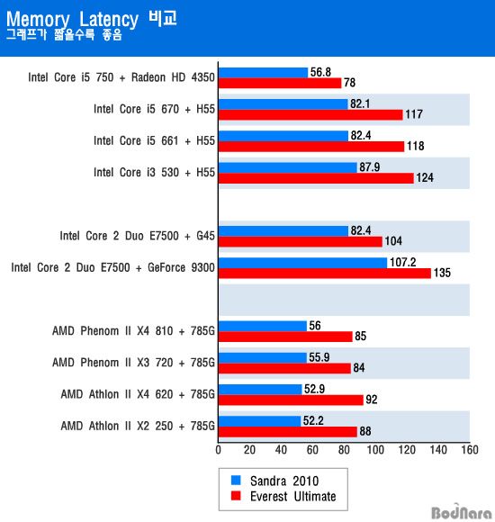 Å×½ºÆ® °á°ú CPU¿¡¼­ Á÷Á¢ ¸Þ¸ð¸®¿¡ Á¢±ÙÇÏ´Â ¸°ÇÊµå ±â¹Ý ÄÚ¾î i5-750°ú AMD Æä³Ñ/¾Ö½½·Ð ÇÁ·Î¼¼¼­µéÀº Sandra¿¡¼­ 50ns´ë, Everest¿¡¼­ 80ns ¾ÈÆÆÀÇ ¸Þ¸ð¸® ·¹ÀÌÅϽø¦ º¸ÀÌÁö¸¸, Ŭ¶ôµ¥ÀÏÀº ¸°Çʵ庸´Ù GMCH¸¦ ÅëÇØ ¸Þ¸ð¸®¿¡ ¿¬°áµÇ´Â LGA775 Ç÷§Æû ÄÚ¾î 2 µà¿À¿Í ºñ½ÁÇÑ ¸Þ¸ð¸® ·¹ÀÌÅϽø¦ º¸À̰í ÀÖ´Ù. (¹°·Ð ÄÚ¾î 2 µà¿À ½Ã½ºÅÛÀº DDR2-800 CL5-5-5 ½Ã½ºÅÛÀ̱⠶§¹®¿¡ Ŭ¶ôµ¥Àϰú ¶È°°Àº Á¶°ÇÀº ¾Æ´Ï´Ù)