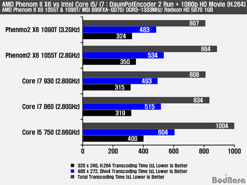 Æ®·£½ºÄÚµù°ú Ç® HD ¿µ»óÀ» °¨»óÇÏ´Â ´ÙÁß½ÇÇà ȯ°æÀº ¸ÖƼÄÚ¾î CPUÀÇ È°¿ëµµ°¡ ³ô¾ÆÁö´Âµ¥ ½ÇÁ¦·Î AMD Æä³Ñ2 X6 ½Ã¸®Áî 2Á¾Àº µ¿±ÞÀÇ °æÀï Á¦Ç°µé°ú ºñ±³ÇÏ¿© Æ®·£½ºÄÚµù ½Ã°£¿¡¼µµ Â÷ÀÌÀ» º¸¿©ÁÖ°í ÀÖ´Ù. À̹ø °á°ú´Â ÇÏÀÌÆÛ½º·¹µùÀ» Áö¿øÇÏ´Â CPU´Â ¹°¸®Äھ ´õ ¸¹Àº CPUÀÇ ¼º´ÉÀ» ¾Õ¼Áö ¸øÇÏ´Â °á°ú¸¦ º¸¿©ÁØ´Ù.