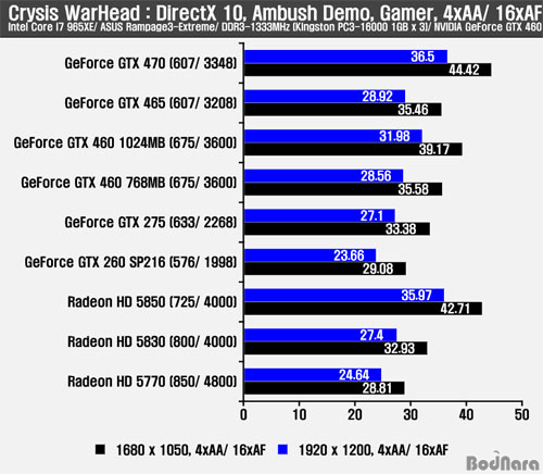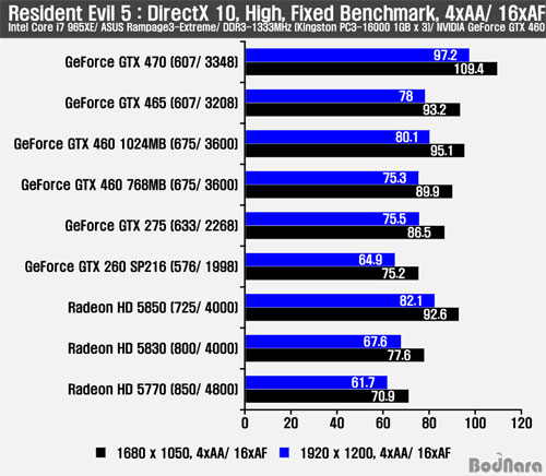 Resident Evil 5¿¡ AA/ AF¸¦ Àû¿ëÇÑ °á°ú ÁöÆ÷½º GTX 460Àº Crysis WarHead¿Í ´Þ¸® ¸Þ¸ð¸® ÀÎÅÍÆäÀ̽º°¡ 192bit·Î 256bit¸¦ °¡Áø ÁöÆ÷½º GTX 460 1GB/ GTX 465º¸´Ù ³·Àº ÇÁ·¹ÀÓÀ» Á¦°øÇß´Ù. ±×·¯³ª, Á÷Á¢ °æÀïÀÌ µÇ´Â ¶óµ¥¿Â HD 5830ÀÌ 256bit ÀÎÅÍÆäÀ̽º¸¦ Á¦°øÇϰí ROP°¡ 16À¸·Î ³·¾ÆÁ® ¿ÀÈ÷·Á 192bit ÀÎÅÍÆäÀ̽ºÀÎ ÁöÆ÷½º GTX 460 768MBÀÇ ¼º´ÉÀÌ ´õ ³ô°Ô ³ªÅ¸³µ´Ù. °íÇØ»óµµ¿Í AA/ AF 󸮿¡¼ ¸Þ¸ð¸® ÀÎÅÍÆäÀ̽º¿Í ´ë¿ªÆø, ROP°¡ ´õ ³ôÀº ÁöÆ÷½º GTX 400 ½Ã¸®Áî°¡ Àü¹ÝÀûÀ¸·Î À¯¸®ÇÏ°Ô ³ªÅ¸³µ´Ù.