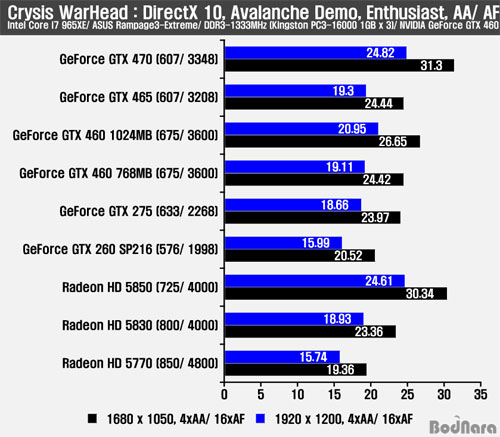 ±×·¡ÇȿɼÇÀ» Gamer·Î ¼³Á¤ÇÒ °æ¿ì ÁöÆ÷½º GTX 460 768MB ÁöÆ÷½º GTX 465¿Í ºñ±³ÇØ °íÇØ»óµµ¿¡¼ ±Ù¼ÒÇÏ°Ô ³·Àº ÇÁ·¹ÀÓÀ» Á¦°øÇßÀ¸¸ç, 1GB´Â Äí´ÙÄھ 16°³ ÀûÀº 336°³Áö¸¸, °°Àº 256bit ¸Þ¸ð¸® ÀÎÅÍÆäÀ̽º¿Í Çâ»óµÈ Ŭ·°À» ¹ÙÅÁÀ¸·Î ¿ÀÈ÷·Á ´õ ³ôÀº ÇÁ·¹ÀÓÀ» Á¦°øÇß´Ù. ±×·¡ÇÈ ¼³Á¤ÀÌ ³ô¾ÆÁø Enthusiast ¼³Á¤¿¡¼ÀÇ °á°ú´Â 768MB´Â Å×½ºÆ® ÇØ»óµµ ¸ðµÎ ±Ù¼ÒÇÏ°Ô ¶³¾îÁ³À¸³ª Å« Â÷ÀÌ´Â ¾ø¾ú°í 1GB´Â °íÇØ»óµµ¿¡¼´Â Â÷À̰¡ ÁÙ¾úÀ¸³ª ±Ù¼ÒÇÏ°Ô ³ôÀº ÇÁ·¹ÀÓÀ» Á¦°øÇÑ´Ù. ÁöÆ÷½º GTX 460 768MB´Â ±Ù¼ÒÇÑ Â÷ÀÌ·Î ¶óµ¥¿Â HD 5830À» ¾Õ¼´Â ÇÁ·¹ÀÓÀ» Á¦°øÇÑ´Ù.