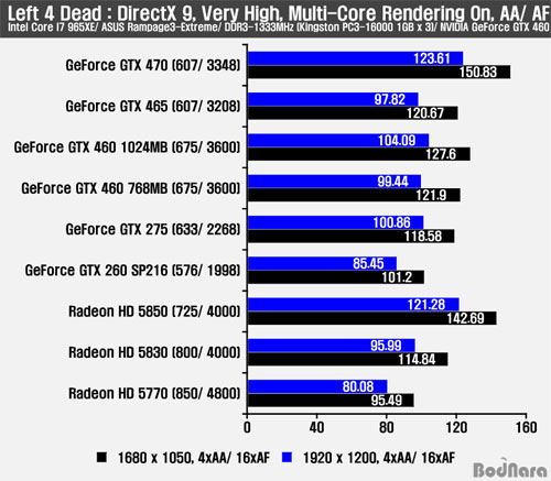 Left 4 Dead¿¡ AA/ AF¸¦ Àû¿ëÇÑ °á°ú´Â ÁöÆ÷½º GTX 460 768MB´Â ¶óµ¥¿Â HD 5830À» Å×½ºÆ® ÇØ»óµµ ¸ðµÎ¿¡¼ ¾Õ¼¹À¸¸ç, 1GB´Â ÁöÆ÷½º GTX 465¸¦ ¾Õ¼± ¼º´ÉÀ» Á¦°øÇϰí ÀÖ´Ù. ÇÏÁö¸¸, ¶óµ¥¿Â HD 5850°ú´Â ²Ï Â÷À̸¦ ³ªÅ¸³µ´Ù.