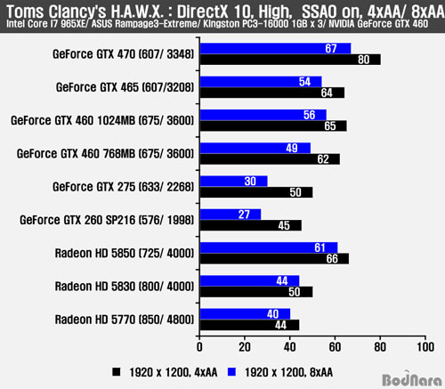 HAWX °ÔÀÓÀº ¶óµ¥¿Â HD 5000 ½Ã¸®Á´Ù ÁöÆ÷½º GTX 400 ½Ã¸®ÁîÀÇ ¼º´ÉÀÌ Àü¹ÝÀûÀ¸·Î ¿ì¼öÇÏ°Ô ³ªÅ¸³µÀ¸¸ç, ÁöÆ÷½º GTX 460 768MB´Â ¶óµ¥¿Â HD 5830À» ¸®µåÇß°í 1GB´Â ¶óµ¥¿Â HD 5850¿¡ °íÇØ»óµµ¿Í 8xAA¿¡¼ ¼º´É Â÷À̰¡ ³ªÅ¸³µÀ¸³ª 4xAA¿¡¼´Â ±× Â÷À̰¡ ÁÙ¾ú´Ù. ÁöÆ÷½º GTX 400 ½Ã¸®Áî´Â ÁöÆ÷½º GTX 200 ½Ã¸®Áîµéº¸´Ù 8xAA Àû¿ë½ÃÀÇ ¼º´É ÀúÇϰ¡ ÁÙ¾îµç °Íµµ È®ÀεȴÙ. HAWXµµ Resident Evil5¿¡¼Ã³·³ ¸Þ¸ð¸® ÀÎÅÍÆäÀ̽º, ´ë¿ªÆø, ROP ¼ö¿¡ µû¸¥ °á°ú°¡ ÀÛ¿ëÇÏ´Â °ÍÀ¸·Î ÆÇ´ÜµÈ´Ù.