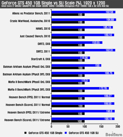 ÇØ»óµµ°¡ ³ô¾ÆÁø 1920 x 1200 ÇØ»óµµ¿¡¼ÀÇ ÁöÆ÷½º GTS 450 SLiÀÇ ¼º´É Çâ»óÀº ÃÖ¼Ò 15%¿¡¼ ÃÖ´ë 94%ÀÎ °ÍÀ¸·Î È®ÀεǸç, Æò±Õ Çâ»óÀº 73.99%´Ù. µ¿ÀÏÇÑ 8°³ÀÇ °ÔÀÓÀ¸·Î ºñ±³½Ã ÁöÆ÷½º GTX 460 SLi´Â 79.32% (1GB)/ 76.45% (768MB), ÁöÆ÷½º GTS 450 SLi´Â 83.36%°¡ Çâ»óµÇ¾î ¼º´É Çâ»ó ºñÀ²Àº ÁöÆ÷½º GTS 450 SLi°¡ ´õ ³ô°Ô ³ªÅ¸³µ´Ù.
