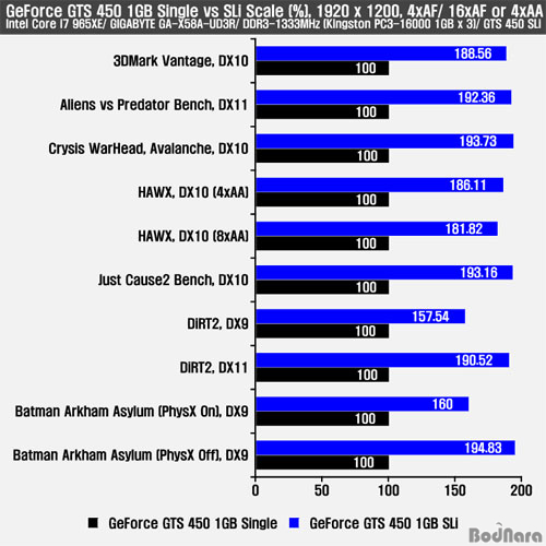 1920 x 1200 ÇØ»óµµ¿¡ 4xAA/ 16xAF ¶Ç´Â 4xAA¸¦ Àû¿ëÇßÀ» ¶§ ÁöÆ÷½º GTS 450 SLi´Â ÃÖ¼Ò 57%¿¡¼ ÃÖ´ë 94%ÀÇ Çâ»óÀÌ È®ÀεǸç, Æò±Õ 83.86%·Î È®ÀεȴÙ. µ¿ÀÏÇÑ 8°³ÀÇ °ÔÀÓÀ¸·Î ºñ±³½Ã ÁöÆ÷½º GTX 460 SLi´Â 76.13% (1GB)/ 74.44% (768MB), ÁöÆ÷½º GTS 450 SLi´Â 82.21%°¡ Çâ»óµÇ¾î ¼º´É Çâ»ó ºñÀ²Àº ÁöÆ÷½º GTS 450 SLi°¡ ´õ ³ô°Ô ³ªÅ¸³µ´Ù.