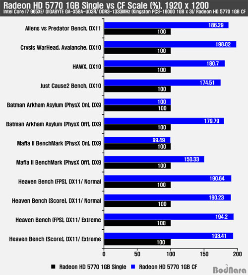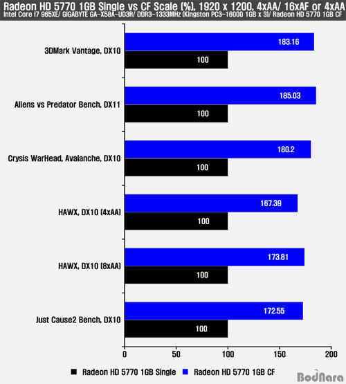 ¶óµ¥¿Â HD 5770 CFÀÇ Çâ»óÀº ÃÖ¼Ò -0.51%¿¡¼ ÃÖ´ë 98.02%·Î È®ÀεǸç, Æò±Õ Çâ»óÀº 69.80%´Ù. µ¿ÀÏÇÑ 12°³ÀÇ °ÔÀÓÀ¸·Î ºñ±³½Ã ¶óµ¥¿Â HD 5770 CF´Â 69.80%, ÁöÆ÷½º GTS 450 SLi´Â 78.99%·Î ¼º´É Çâ»ó ºñÀ²Àº ÁöÆ÷½º GTS 450 SLi°¡ ´õ ³ô°Ô ³ªÅ¸³µ´Ù.