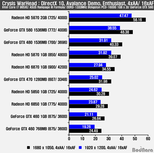 ±×·¡ÇȿɼÇÀ» Enthusiast·Î ¼³Á¤Çϰí 4xAA/ 16xAF¸¦ Àû¿ëÇØ ºÎÇϸ¦ ´Ã·Á Å×½ºÆ®¸¦ ÁøÇàÇÑ °á°ú AA/ AF¸¦ Àû¿ëÇÏÁö ¾ÊÀº °á°ú¿Í °°ÀÌ ÁöÆ÷½º GTX 580Àº µà¾ó GPUÀÎ ¶óµ¥¿Â HD 5970º¸´Ù ³·Àº ÇÁ·¹ÀÓÀ» Á¦°øÇϳª ½Ì±Û GPU Áß¿¡¼´Â °¡Àå ³ôÀº ÇÁ·¹ÀÓÀ» Á¦°øÇß´Ù.