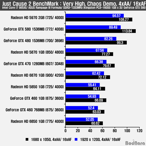 Just Cause2¿¡ 4xAA/ 16xAF¸¦ Àû¿ëÇÒ °æ¿ìµµ Crysis Warhead¿Í ¸¶Âù°¡Áö·Î ÀúÇØ»óµµ¿Í 4xAA/ 16xAF°¡ Àû¿ëµÉ °æ¿ì ÁöÆ÷½º GTX 580Àº µà¾ó GPUÀÎ ¶óµ¥¿Â HD 5970À» ¾Õ¼¹À¸³ª °íÇØ»óµµ¿Í AA/ AF°¡ Àû¿ëµÇ¸é Á¶±Ý ´õ ³·Àº ÇÁ·¹ÀÓÀ» Á¦°øÇÏ´Â °ÍÀÌ È®ÀεȴÙ.
