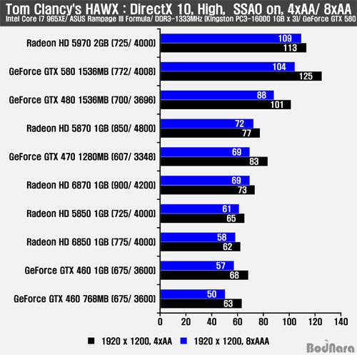 HAWX´Â ¾Õ¼¿Í ´Þ¸® ÁöÆ÷½º GTX 580ÀÌ Àü¹ÝÀûÀ¸·Î ¾Õ¼Áö ¸øÇϰí ÀúÇØ»óµµ¿Í 4xAA ¼³Á¤¿¡¼´Â ¾Õ¼³ª 1920 x 1200°ú 8xAA°¡ Àû¿ëµÉ °æ¿ì ¶óµ¥¿Â HD 5970ÀÌ ¿ªÀüÇßÀ¸¸ç, ÁöÆ÷½º GTX 580Àº ¾à°£ ³·Àº ÇÁ·¹ÀÓÀ» Á¦°øÇÏ´Â °ÍÀÌ È®ÀεȴÙ.