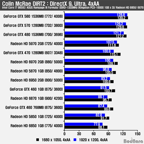 ±×·¡ÇȿɼÇÀ» Enthusiast·Î ¼³Á¤Çϰí 4xAA/ 16xAF¸¦ Àû¿ëÇØ ºÎÇϸ¦ ´Ã·Á Å×½ºÆ®¸¦ ÁøÇàÇÑ °á°ú AA/ AF¸¦ Àû¿ëÇÏÁö ¾ÊÀº °á°ú¿Í ¸¶Âù°¡Áö·Î HD 6900 ½Ã¸®Áî´Â GTX 570À» ¸ðµÎ ¾Õ¼´Â ÇÁ·¹ÀÓÀ» Á¦°øÇϸç, ƯÈ÷ °íÇØ»óµµ¿Í AA Àû¿ë½Ã À¯¸®ÇÑ °ÍÀ¸·Î È®Àεǰí ÀÖ´Ù.