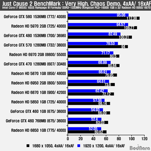 Just Cause2¿¡ 4xAA/ 16xAF¸¦ Àû¿ëÇÒ °æ¿ì HD 6970Àº GTX 570¿¡ ¹Ð¸®°í ÀÖÀ¸¸ç, GTX 470º¸´Ù ¾Õ¼± ÇÁ·¹ÀÓÀ» Á¦°øÇϰí ÀÖ´Ù. HD 6950Àº HD 5870°ú ºñ±³ÇØ ¾à°£ ³·Àº ÇÁ·¹ÀÓÀ» Á¦°øÇϰí ÀÖ´Â °ÍÀ¸·Î È®ÀεȴÙ.