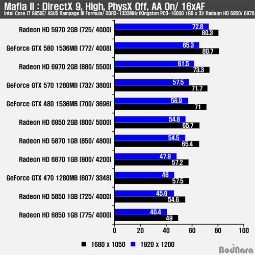 Mafia II °ÔÀÓ¿¡¼µµ Crysis Warhead¿Í °°ÀÌ HD 6970Àº °æÀï Á¦Ç°ÀÌ µÇ´Â GTX 570º¸´Ù À¯¸®ÇÑ ¸ð½ÀÀ» À¯ÁöÇßÀ¸¸ç, HD 6950Àº HD 5870À» ±Ù¼ÒÇÏ°Ô ¾Õ¼¹°í GTX 480º¸´Ù´Â ³·Àº ÇÁ·¹ÀÓÀ» Á¦°øÇß´Ù.