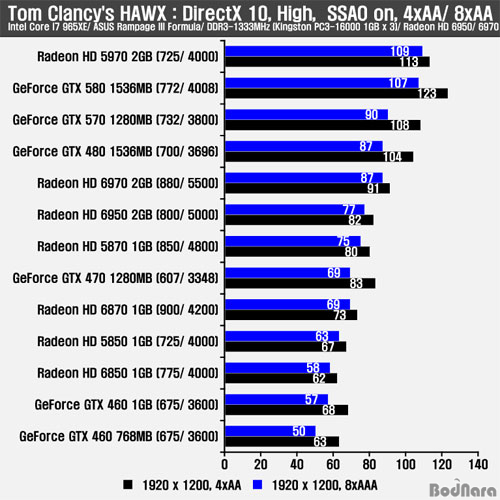HAWX °ÔÀÓ¿¡ AA¸¦ Àû¿ë½Ã HD 6970Àº AA ¿É¼ÇÀÌ ³·Àº 4xAAÀÇ °æ¿ì ÇÁ·¹ÀÓÀÌ ³·¾ÒÀ¸³ª 8xAA Àû¿ë½Ã¿¡´Â GTX 480°ú µ¿ÀÏÇÑ ÇÁ·¹ÀÓÀ» Á¦°øÇß´Ù. HD 6950Àº HD 5870°ú GTX 470À» ¾Õ¼ °íÇØ»óµµ¿Í AA/ AF Áö¿ø½Ã À¯¸®ÇÑ ¸ð½ÀÀ» º¸¿©ÁØ´Ù.