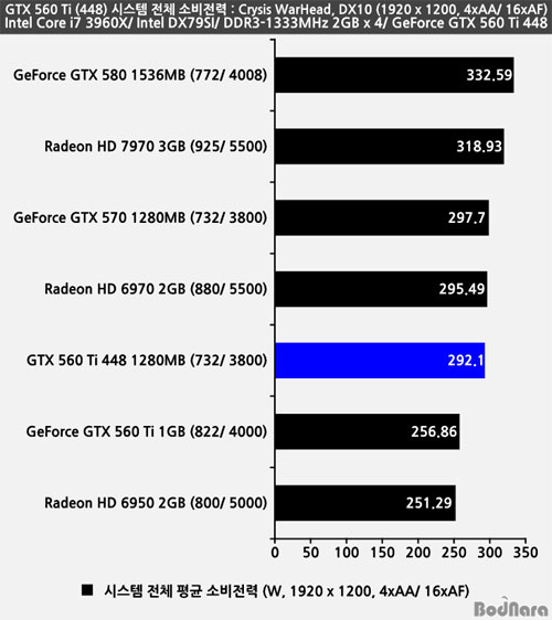 Crysis WarHead °ÔÀÓÀÇ ¼ÒºñÀü·Â ÃøÁ¤ °á°ú´Â Àüü ½Ã½ºÅÛÀÇ ¼ÒºñÀü·ÂÀ¸·Î ÃøÁ¤µÈ Æò±Õ°ªÀ» ±¸ÇØ ºñ±³Çß´Ù. ÁöÆ÷½º GTX 560 Ti 448Àº ¾Õ¼ÀÇ 3DMark Vantage °á°ú¿Í ´Þ¸® ÁöÆ÷½º GTX 570 ¹× ¶óµ¥¿Â HD 6970 2GBº¸´Ù ¾à°£ ³·Àº ¼ÒºñÀü·ÂÀ» Á¦°øÇÏ´Â °ÍÀ¸·Î È®ÀεȴÙ.