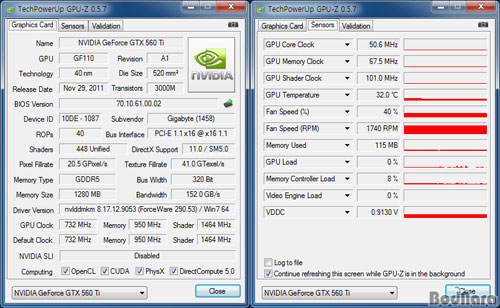 ÁöÆ÷½º GTX 560 Ti 448Àº GPU-Z 0.5.7 ¹öÀü (2012³â 12¿ù 27ÀÏÀÚ, ±¸ ATI Ä«µå ÀåÂø ½Ã½ºÅÛÀÇ Ä¡¸íÀûÀÎ ¿¡·¯ ¼öÁ¤)¿¡¼ ½ºÆ®¸² ÇÁ·Î¼¼¼³ª ROPs µîÀÇ ½ºÆåÀÌ Á¤»óÀûÀ¸·Î ÀνĵȴÙ. ¾ÆÀ̵é½Ã ¼ÒºñÀü·ÂÀ» ÁÙÀ̱â À§ÇØ Å¬·° ½ºÀ§ÄªÀ» Áö¿øÇϸç, ÄÚ¾î 50.6/ ¸Þ¸ð¸® 270 (67.5)MHz·Î Ŭ·°ÀÌ ³·¾ÆÁø´Ù.