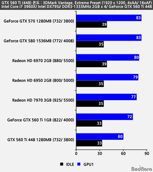 ÁöÆ÷½º GTX 560 Ti 448À» Æ÷ÇÔÇÏ¿© Å×½ºÆ®¿¡ »ç¿ëµÈ ±×·¡ÇÈÄ«µåµéÀÇ º¥Ä¡¸¶Å© ¹× °ÔÀÓÀ» µ¿ÀÛÇÏ´Â µ¿¾ÈÀÇ ½Ã½ºÅÛÀÇ Àüü ¼ÒºñÀü·Â°ú ¿Âµµ¸¦ ºñ±³Çß´Ù.
