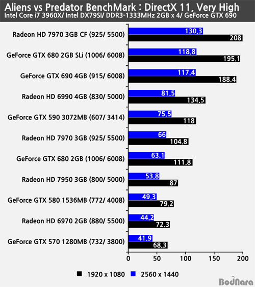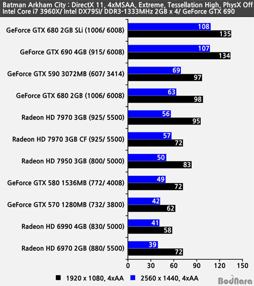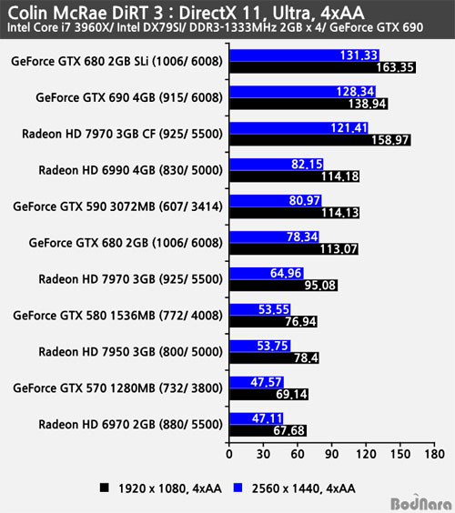 ÁöÆ÷½º GTX 690°ú ÁöÆ÷½º GTX 680 2GB SLi´Â AA ¹ÌÀû¿ë ¹× 4xAA Àû¿ë »óȲ¿¡¼ ¼·Î ±ÙÁ¢ÇÑ ÇÁ·¹ÀÓÀ» ³»ÁÖ°í ÀÖÀ¸¸ç, ¶óµ¥¿Â °è¿ÀÇ µà¾ó GPU ¶óµ¥¿Â HD 6990°ú ¶óµ¥¿Â HD 7970 3GB CF ±¸¼ºÀº ¸ÖƼ GPUÀÎ CrossFire X°¡ Á¦´ë·Î µ¿ÀÛÇÏÁö ¸øÇÑ Å¿¿¡ ½Ì±Û GPU Ŭ·° ¸¸ÅÀÇ ¼º´ÉÀ» Á¦°øÇß´Ù. ¹Ý¸é ¿£ºñµð¾Æ (NVIDIA) ÁöÆ÷½º °è¿Àº ¸ÖƼ GPUÀÎ SLi°¡ Á¦´ë·Î µ¿ÀÛÇØ ¼º´ÉÀ» ³»Áá´Ù.