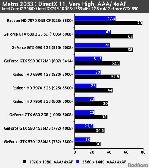¸ÞÆ®·Î 2033 ¿ª½Ã ¸Þ¸ð¸® ºñÆ® ¼ö¿Í ¸Þ¸ð¸® ¿ë·®¿¡ µû¶ó °íÇØ»óµµ¿¡¼ »ó´ëÀûÀ¸·Î ºÒ¸®ÇÑ ÄÉÇ÷¯ (Kepler) °è¿Àº AMDº¸´Ù ³·Àº ÇÁ·¹ÀÓÀ» Á¦°øÇßÀ¸¸ç, ÁöÆ÷½º GTX 690Àº °íÇØ»óµµ (2560 x 1440, 4xAA/16xAF) Àû¿ë½Ã ±Ù¼ÒÇÑ ÇÁ·¹ÀÓÀ¸·Î ÁöÆ÷½º GTX 680 2GB SLi¸¦ ¾Õ¼¹´Ù. 1920 x 1080 ÇØ»óµµ¿¡¼´Â ÁöÆ÷½º GTX 680 2GB SLi°¡ ±Ù¼ÒÇÏ°Ô À¯¸®Çß´Ù.