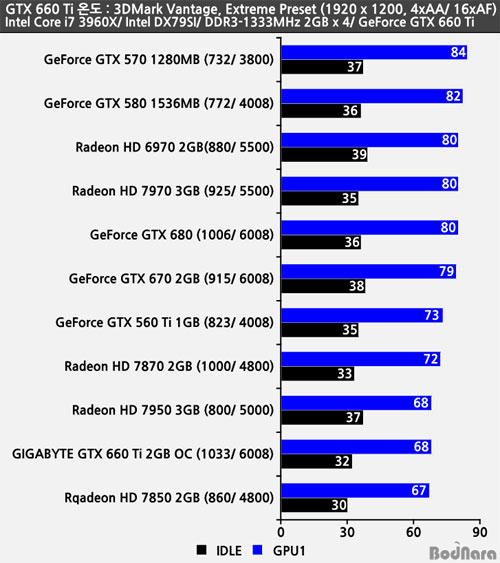 ¿Âµµ´Â °³¹æµÈ »óÅÂÀÇ »ç¹«½Ç¿¡¼ ÃøÁ¤ÇÏ¿´À¸¹Ç·Î ÄÉÀ̽º ³»ºÎ¿¡ ÀåÂøµÈ °æ¿ì¿Í ´Þ¶ó »ó´ëÀûÀÎ ºñ±³·Î Âü°íÇÏÀÚ. ·¹ÆÛ·±½º ÁöÆ÷½º GTX 660 Ti´Â ÁöÆ÷½º GTX 670°ú À¯»çÇÑ Ä𸵠¼Ö·ç¼ÇÀ» Àû¿ëÇØ ºñ½ÁÇϰųª ¾à°£ ³·Àº ¿Âµµ°¡ ¿¹»óµÇ¸ç, Å×½ºÆ®¿¡ »ç¿ëµÈ ±â°¡¹ÙÀÌÆ® ÁöÆ÷½º GTX 660 Ti OC´Â À©µåÆ÷½º 2X Àü¿ë Ä𸵠¼Ö·ç¼ÇÀ» Àû¿ëÇØ ³ôÀº ÄÚ¾î Ŭ·° Àû¿ë¿¡µµ ¶óµ¥¿Â HD 7850 ·¹ÆÛ·±½º Äð·¯ ¼öÁØÀÇ ¿Âµµ¸¦ Á¦°øÇÑ´Ù.