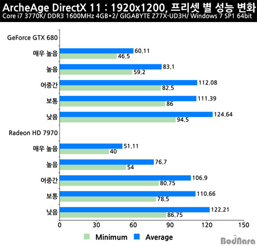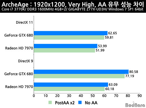 AA ¼³Á¤¿¡ µû¶ó NVIDIA¿Í AMDÀÇ ½Ì±Û GPU ÃÖ»óÀ§ ¸ðµ¨ÀÎ ÁöÆ÷½º GTX 680°ú ¶óµ¥¿Â HD 7970À» ÀÌ¿ëÇØ Å×½ºÆ®ÇÑ °á°ú, AA¸¦ Àû¿ëÇÏÁö ¾Ê¾ÒÀ» ¶§¿Í PostAA x2¸¦ Àû¿ëÇßÀ» ¶§ÀÇ ¼º´ÉÀº Æò±Õ 3ÇÁ·¹ÀÓ ³»¿Ü·Î °üÃøµÇ¾ú´Ù.