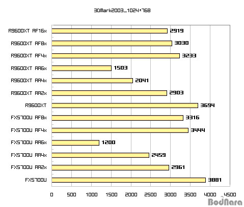 À̹ø¿¡´Â 3DMark 2003¿¡¼­ÀÇ AA ¹× AF Àû¿ë °á°úÀÌ´Ù. ±×·±µ¥ 3DMark 2003Àº AquaMark3¿Í´Â »ó¹ÝµÈ °á°ú¸¦ º¸¿©ÁÖ°í ÀÖ´Ù. ±âº» ¼º´ÉÀÌ GF FX5700UÀÇ ½Â¸®·Î ³ª¿Â °ÍÀº µÑ° Ä¡´õ¶óµµ, AA4X Àû¿ë¿¡ µû¸¥ ¼º´É Ç϶ôÆøÀÌ Radeon 9600 XT°¡ ´õ Å« °ÍÀ¸·Î ³ªÅ¸³ª°í ÀÖ´Ù. ¾Æ¸¶µµ DirectX8 ±â¹ÝÀÇ AquaMark3¿Í´Â ´Þ¸® 3DMark2003¿¡´Â DirectX9ÀÇ ¼º´É Å×½ºÆ®°¡ Æ÷ÇÔµÈ ÀÌÀ¯°¡ ¾Æ´Ò±î ½ÍÀºµ¥... ¾î·µç nVIDIAÀÇ AA4X¿Í ATIÀÇ AA6X ǰÁúÀÌ À¯»çÇÏ´Ù´Â ³í¸®¸¦ Àû¿ëÇϸé GF FX5700UÀÇ ½Â¸®°¡ Á» ´õ È®°íÇØÁø´Ù. ¿©ÀüÈ÷ FX5700UÀÇ AA6X´Â ¼º´É Ç϶ôÆøÀÌ Å©Áö¸¸ ATI¿ÍÀÇ ½Î¿ò¿¡¼­´Â ²¨³¾ Çʿ䵵 ¾ø´Â ºñÀåÀÇ Ä«µåÀÏ »ÓÀÌ´Ï...