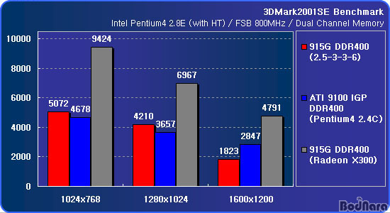 8.x ¼¼´ëÀÇ º¥Ä¡¸¶Å© ÅøÀÎ 3DMark2001SEÀÇ Å×½ºÆ® °á°ú´Â 915GÀÇ ³»Àå ±×·¡ÇÈ ¼º´ÉÀÌ 1024x768¿¡¼