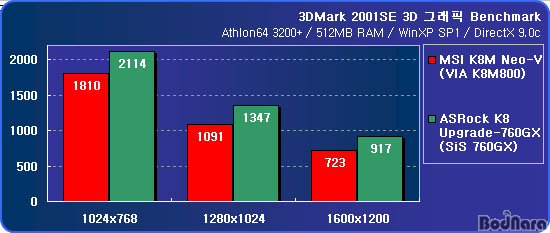 3DMark 2001SE º¥Ä¡¸¶Å© Å×½ºÆ® °á°ú´Â K8M800 Ĩ¼ÂÀ» »ç¿ëÇÑ K8M Neo-Vº¸´Ù SiS 760GX¸¦ »ç¿ëÇÑ K8 Upgrade-760GXÀÇ ¼º´ÉÀÌ ´õ ³ô°Ô ³ª¿Ô´Ù. µé¾îÀÖ´Â ³»Àå ±×·¡ÇÈ ÄÚ¾îÀÇ ½ºÆå ÀÚü¿¡ Â÷À̰¡ ÀÖ´Â ¸¸Å­ SiS 760GX°¡ K8M800¿¡ ºñÇØ ºü¸¥ °á°ú¸¦ º¸¿©ÁØ´Ù.