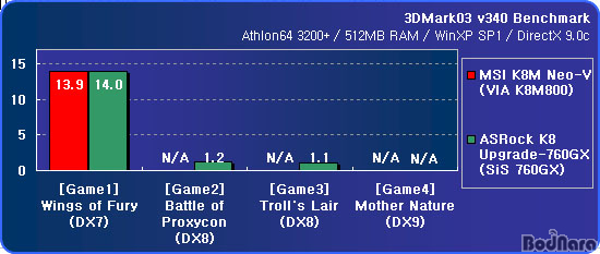 3DMark03ÀÇ °æ¿ì DirectX 7.0À» Áö¿øÇÏ´Â Game1À» Á¦¿ÜÇϸé K8M800¿¡¼­´Â Game2, 3, 4 Ç׸ñÀº Å×½ºÆ®°¡ µÇÁö ¾Ê´Â´Ù. ½ºÆå»ó DirectX 8.1À» Áö¿øÇÏ´Â SiS 760GXÀÇ °æ¿ì¿¡´Â Game2, 3 Ç׸ñ±îÁö Å×½ºÆ®°¡ °¡´ÉÇÏÁö¸¸ °á°ú´Â À§¿¡¼­ º¸´Â ¹Ù¿Í °°ÀÌ Æò±Õ 1ÇÁ·¹ÀÓÀÇ Âü´ãÇÑ ¼öÁØÀ¸·Î Áö¿øÇÑ´Ù´Â °Í°ú ¿øÈ°ÇÏ°Ô »ç¿ëÇÒ ¼ö ÀÖ´Â °Í°ú´Â ºÐ¸í ´Ù¸£´Ù´Â °ÍÀ» ¾Ë ¼ö ÀÖ´Ù.