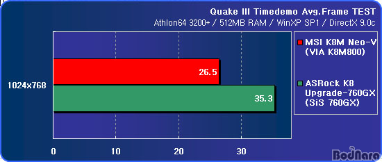 Quake III ŸÀÓµ¥¸ð Æò±Õ ÇÁ·¹ÀÓ ÃøÁ¤ °á°ú´Â SiS 760GXÀÇ ³»Àå ±×·¡ÇÈ ¼º´ÉÀÌ K8M800º¸´Ù ÈξÀ ÁÁÀº °ÍÀ¸·Î ³ªÅ¸³µ´Ù. 1024x768 ÇØ»óµµ¿¡¼­ 10ÇÁ·¹ÀÓ Á¤µµÀÇ Â÷À̸¦ º¸À̰í ÀÖ´Ù.