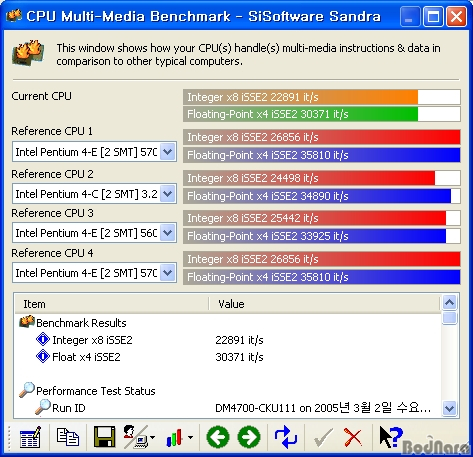 CPUÀÇ ¸ÖƼ¹Ìµð¾î ´É·ÂÀ» ÃøÁ¤ÇÏ´Â Å×½ºÆ®Àε¥ ÁÖ·Î SSE2 ¸í·É¾î°¡ Àû¿ëµÇ¾î Å×½ºÆ®¸¦ ÁøÇàÇÑ´Ù. ÀÎÅÚÀ̳ª AMD µà¾ó CPU·Î ÃøÁ¤ÇÏ´Â °ªµé°ú Å« Â÷À̸¦ º¸ÀÌÁö ¾ÊÀ» Á¤µµ·Î »ó´çÈ÷ ÁÁÀº ¼öÁØÀÇ ¼º´ÉÀÌ ÃøÁ¤µÈ´Ù.
