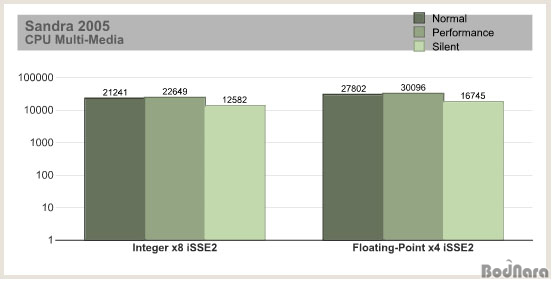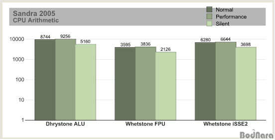 Sandra 2005ÀÇ CPU Arithmetic º¥Ä¡¸¶Å©´Â CPUÀÇ ALU¿Í FPU, SSE2 ¸í·É¾î¿¡ ´ëÇÑ ¼º´ÉÀ» ÃøÁ¤ÇÑ´Ù. Power MasterÀÇ Normal, Performance, SilentÀÇ 3°¡Áö ¼³Á¤¿¡ µû¸¥ ¼º´ÉÀ» ºñ±³ÇÏ¿´À¸¸ç, ¾Õ¼ »ìÆìºÃ´ø CPU-ZÀÇ Å¬·°¿¡ µû¸¥ ¼º´ÉÀÌ ±×´ë·Î µå·¯³ª´Â ºÎºÐÀÌ´Ù.