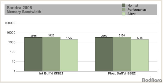 Sandra 2005ÀÇ ¸¶Áö¸· Å×½ºÆ®ÀÎ ¸Þ¸ð¸® ´ë¿ªÆøÀ» ÃøÁ¤ÇÑ °á°úÀÌ´Ù. ¸Þ¸ð¸® ´ë¿ªÆøÀº FSB¿¡ µû¶ó Ŭ·°ÀÌ »ó½ÂÇÏ¸é µ¿½Ã¿¡ º¸´Ù ¸¹Àº ´ë¿ªÆøÀ» ¾ò°Ô µÈ´Ù. ¾Õ¼ »ìÆìº» µÎ°¡Áö Å×½ºÆ®¿¡¼¿Í Å©°Ô ´Ù¸£Áö ¾Ê°Ô FSB°¡ »ó½ÂÇϰí Ŭ·°ÀÌ °¡Àå ³ô°Ô ÃøÁ¤µÈ Performance°¡ °¡Àå ³ô¾ÒÀ¸¸ç, ´ÙÀ½À¸·Î Normal, SilentÀÇ ¼øÀÌ´Ù.