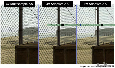±×¸®°í nVIDIAÀÇ Transparency AA´Â GeForce ½Ã¸®ÁîÀÇ ÃֽŠÁ¦Ç°ÀÎ GeForce 7800 Á¦Ç°±º¿¡¸¸ Àû¿ëµÇ°í ÀÖÀ¸³ª ATIÀÇ Adaptive Anti-Aliasing ±â¼úÀº R5xx GPU »Ó¸¸ ¾Æ´Ï¶ó ±× ÀÌÀü ¼¼´ëÀÎ R4xx GPUµéÀÌ ÀåÂøµÈ Radeon X8xx ½Ã¸®Áî¿¡¼­µµ Áö¿øÀÌ °¡´ÉÇÏ´Ù´Â ÀåÁ¡ÀÌ ÀÖ´Ù.