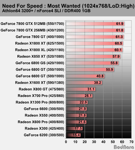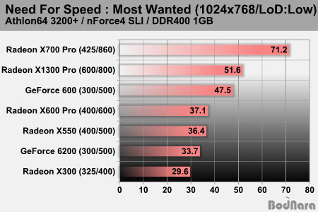 Æò±Õ 30ÇÁ·¹ÀÓ¿¡ ¾Æ±õ°Ô ¹Ì´ÞµÈ Radeon X700 Pro°¡ ÇÑÇ®ÀÌ¶óµµ ÇÏµí Æò±Õ 71.2ÇÁ·¹ÀÓÀ̶ó´Â ³ôÀº °á°ú¸¦ º¸¿©ÁÖ¾úÀ¸¸ç, Radeon X1300 Proµµ GeForce 6600 ³ë¸ÖÀ» Á¦Ä¡¸ç 51.6ÇÁ·¹ÀÓÀ» ±â·ÏÇÏ¿´´Ù.