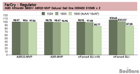 SLI x16ÀÇ °æ¿ì´Â ±âÁ¸ nForce4 SLIº¸´Ù ¸ðµç Å×½ºÆ®¿¡¼ ¿ÀÈ÷·Á ³·Àº ¼º´ÉÀ» º¸¿©ÁÖ°í ÀÖ´Ù. ÀÌ´Â µÎ °³ÀÇ