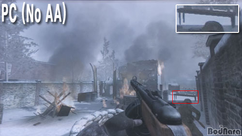 ¾ÈƼ ¾Ù¸®¾î½Ì(Anti-aliasing) ºÎºÐÀº ÇÊÀÚµµ »ó´çÈ÷ ÀǾÆÇß´ø ºÎºÐÀε¥, XBOX 360ÀÇ GPU´Â 4x AA¸¦ ó¸®Çصµ ¼º´É ÀúÇϰ¡ °ÅÀÇ ÀϾÁö ¾Ê´Âµ¥µµ ºÒ±¸Çϰí XBOX 360ÆÇ Call of Duty2´Â È­¸é¿¡¼­ °è´Ü Çö»óÀ» º¼ ¼ö ÀÖ´Ù.