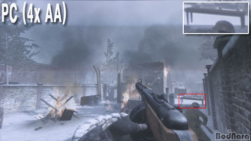 Áï, ¹Ï±â´Â ¾î·ÆÁö¸¸... °ÔÀÓ Ç÷¹ÀÌ È­¸éÀ¸·Î º¸¸é XBOX 360¿ë Call of Duty2´Â MS¿Í ATI¿¡¼­ ÀÚ¶ûÇϴ 10MB ÀÓº£µðµå DRAM°ú Çȼ¿ ÇÁ·Î¼¼¼­¸¦ Ȱ¿ëÇÑ 4x MSAA¸¦ ÀüÇô Ȱ¿ëÇÏÁö ¸øÇϰí ÀÖ´Â °ÍÀÌ´Ù.