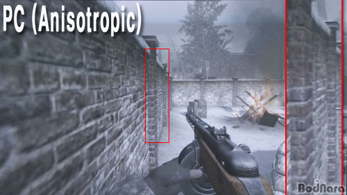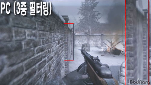 °°Àº Àå¸é¿¡¼­ PCÆÇÀº 3Áß ÇÊÅ͸µ½Ã XBOX 360º¸´Ù ¾à°£ ´õ ¹¶°ÔÁö´Â ¸ð½ÀÀ» º¸¿´À¸¸ç, ºñµî¹æ¼º ÇÊÅ͸µ(Anisotropic Filtering)À» »ç¿ëÇϸé Áß°£ ºÎºÐ º®ÀÇ µðÅ×ÀÏÀÌ ¿ÏÀüÈ÷ »ì¾Æ³­´Ù. XBOX 360ÆÇÀÇ ÅØ½ºÃÄ ÇÊÅÍ´Â AnisotropicÀº ¾Æ´Ñ °ÍÀ¸·Î º¸ÀδÙ.