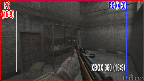 PCÆÇ Call of Duty2´Â 1280x720 ÇØ»óµµÀÇ ±âº» ºñÀ²ÀÏ ¶§ °°Àº Àå¸é¿¡¼­ XBOX 360º¸´Ù À§/¾Æ·¡·Î È­¸éÀÌ Á»´õ ³ª¿À°í ÀÖ´Ù. XBOX 360ÆÇÀÌ ÆÈ¸ñ ºÎºÐ¿¡¼­ È­¸éÀÌ À߸®´Âµ¥ ºñÇØ PCÆÇÀº ÆÈ²ÞÄ¡ ºÎºÐ±îÁö ³ª¿Â´Ù.