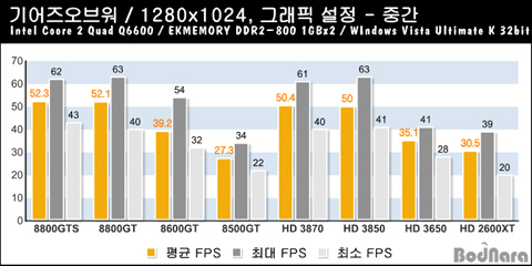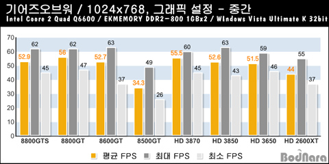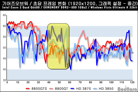 1920x1200 ÇØ»óµµ¸¦ ±âÁØÀ¸·Î »ìÆìº» ÇÁ·¹ÀÓ º¯È­Àε¥ 45ÇÁ·¹ÀÓÀ» ±âÁØ (XBOX360¹öÀüÀÇ ÃÖ°í ÇÁ·¹ÀÓÀÌ 45ÇÁ·¹ÀÓÀ̹ǷΠÀ̸¦ ±âÁØÀ¸·Î »ï¾Ò´Ù.)À¸·Î º»´Ù¸é Àü¹ÝÀûÀ¸·Î NVIDIA Á¦Ç°±º (GIGABYTE GeForce 8800GTS 512MB ³×¹öÀ©ÅͳªÀÌÃ÷2, GIGABYTE GeForce 8800GT Ultra Durable2 512MB VF830)ÀÌ º¸´Ù ¾ÈÁ¤ÀûÀ¸·Î ³ôÀº ÇÁ·¹ÀÓÀ» À¯ÁöÇϰí ÀÖ´Â °ÍÀ» È®ÀÎÇÒ ¼ö ÀÖ´Ù.
