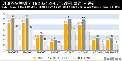 ÇØ»óµµ¸¦ 1920x1200À¸·Î ¿Ã¸®°Ô µÇ¸é °í±ÞÇü ¸ðµ¨ÀÎ GIGABYTE GeForce 8800GTS 512MB ³×¹öÀ©ÅͳªÀÌÃ÷2, GIGABYTE GeForce 8800GT Ultra Durable2 512MB VF830, GIGABYTE Radeon HD 3870 Ultra Durable2 DDR3 512MB À߸¸, GIGABYTE Radeon HD 3850 Ultra Durable2 DDR3 512MB À߸¸ ¸¸ÀÌ 30ÇÁ·¹ÀÓ ÀÌ»óÀÇ ¸ð½ÀÀ» º¸¿©ÁÖ°í ÀÖ´Ù. ÀÌ 4°³ÀÇ Á¦Á¦Ç°µéÀº ÃÖ¼Ò ÇÁ·¹ÀÓµµ 30ÇÁ·¹ÀÓÀ» ³Ñ±â°í ÀÖ¾î ¸ðµç Å×½ºÆ® ±¸°£¿¡¼­ ¾ÈÁ¤ÀûÀÎ °ÔÀÓ Ç÷¹À̸¦ Áö¿øÇϰí ÀÖ´Â °ÍÀ» È®ÀÎÇÒ ¼ö ÀÖ´Ù.
