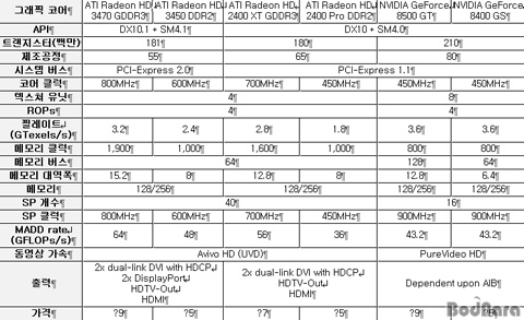 À§ Ç¥´Â HD 3400½Ã¸®Áî¿Í ±âÁ¸ HD 2400 ½Ã¸®Áî, ±×¸®°í ÀÌ¿Í °æÀï»ó´ëÀÎ GeFOrce 8400/8500 ½Ã¸®ÁîÀÇ ½ºÆåÀ» ºñ±³ÇÑ °ÍÀ¸·Î °¢ ¼¼´ëº° Áö¿ø »çÇ× ¹× Ư¡µîÀ» ÇÑ´«¿¡ È®ÀÎÇÒ ¼ö ÀÖÀ» °ÍÀÌ´Ù.