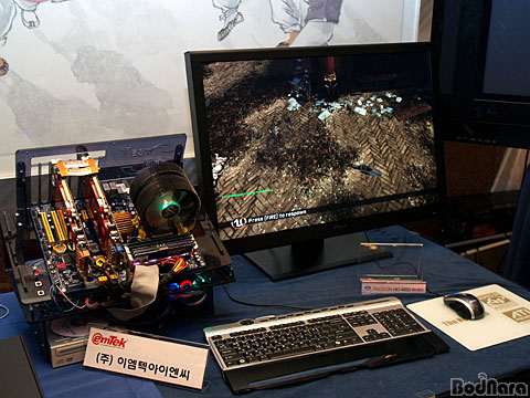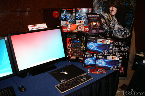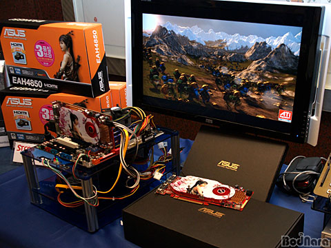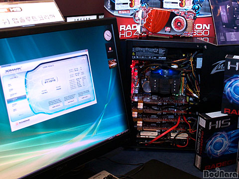 HD 4800 ½Ã¸®Áî ¹ßǥȸ Àå¿¡ Àü½ÃµÈ °¢ Á¦Á¶»çµéÀÇ Á¦Ç° Áß AMD ATI Radeon HD 4850 4°³ÀÇ ±×·¡ÇÈ Ä«µå¸¦ CrossFire X ±¸¼ºÇÏ¿´À»
