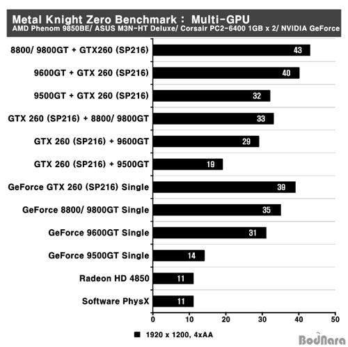 Metal Kinght Zero ¸ÖƼ GPU ±¸¼ºÀÇ ¼º´ÉÀ» º¸¸é ½Ì±Û ±¸¼º°ú ºñ±³ÇÏ¿© ¼º´É ÁÁÀº ±×·¡ÇÈ Ä«µå¸¦ ÁÖ·Î ¼º´ÉÀÌ ³·Àº GPU¸¦ PhysX ¿¬»ê¿¡ ÀÌ¿ëÇÒ °æ¿ì 9500GT¸¦ »ç¿ëÇÒ °æ¿ì¿¡¸¸ ¾à°£ÀÇ ¼º´É Çâ»óÀÌ ÀÌ·ç¾îÁö´Â °ÍÀ¸·Î ³ªÅ¸³µ´Ù. ¹Ý´ë·Î ¼º´ÉÀÌ ³·Àº GPU¸¦ ¸ÞÀÎÀ¸·Î ¼º´ÉÀÌ ³ôÀº GPU¸¦ PhysX ¿¬»ê¿¡ »ç¿ëÇÒ °æ¿ì¿¡´Â Àü¹ÝÀûÀÎ ¼º´ÉÀÇ Çâ»óÀÌ ÀÌ·ç¾îÁö°í ÀÖ´Â °ÍÀ» È®ÀÎÇÒ ¼ö ÀÖ´Ù.
