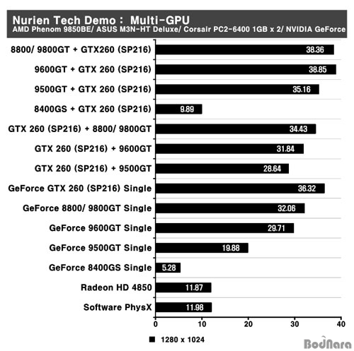Nurien Tech Demoµµ Metal Knight Zero¿Í Å©°Ô ´Ù¸£Áö ¾Ê°Ô ³ôÀº ¼º´ÉÀÇ ±×·¡ÇÈ Ä«µå¸¦ PhysX ¿¬»êÀ¸·Î »ç¿ëÇÏ¿´À» ¶§ Àü¹ÝÀûÀ¸·Î ´õ ³ôÀº ¼º´ÉÀ» º¸¿©ÁÖ¾ú´Ù. GeForce 8400GSÀÇ °æ¿ì 2¹ø ½½·Ô Áï, PhysX ¿¬»ê Ä«µå·Î »ç¿ëÇÒ °æ¿ì Å×½ºÆ®¸¦ ÁøÇàÇÑ ¸ÞÀκ¸µå¿¡¼­ ȣȯ¼º ¹®Á¦¸¦ º¸¿© Å×½ºÆ® °á°ú¸¦ Æ÷ÇÔÇÏÁö ¸øÇÏ¿´À¸¸ç, ½Ì±Û ±¸¼ºº¸´Ù´Â ¸ÖƼ GPU ±¸¼º¿¡¼­ ¼º´ÉÀÌ ³ô¾ÆÁö´Â °ÍÀ» È®ÀÎÇÒ ¼ö ÀÖ´Ù. GeForce 8800/ 9800GT¸¦ »ç¿ëÇÏ´Â °æ¿ì´Â GeForce 9600GT¸¦ »ç¿ëÇÏ¿´À» ´ëº¸´Ù ¾à°£ ³·Àº ¼öÁØÀÇ ¼º´ÉÀ» º¸¿©ÁÖ°í ÀÖ¾î ÀÌ Å×½ºÆ® °á°ú·Î¸¸ º¸ÀÚ¸é, GeForce 9600GT ÀÌ»óÀÇ ±×·¡ÇÈ Ä«µåÀÇ Çʿ伺ÀÌ Å©Áö ¾ÊÀº °ÍÀ» È®ÀÎÇÒ ¼ö ÀÖ´Ù.